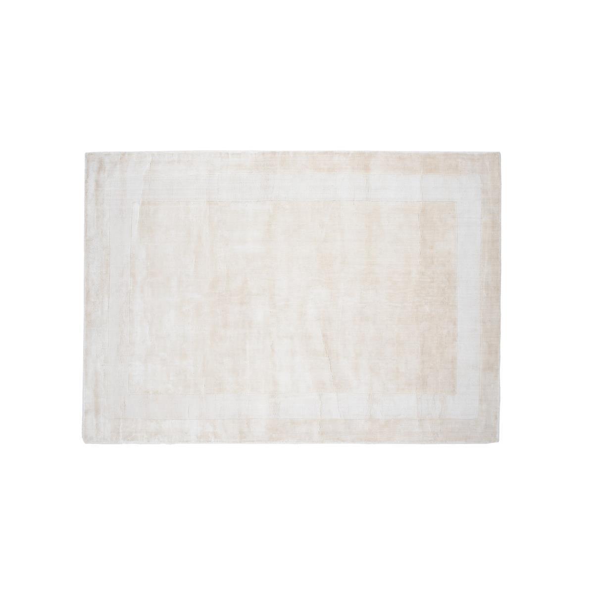Der Teppich hat einen dichten Flor mit einem weiß gewebten Rand , der die Teppichformen umrahmt.