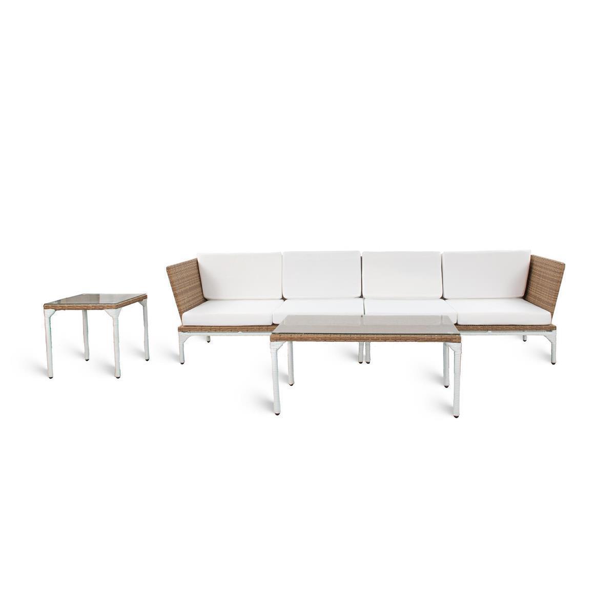 Mit den Farben Beige und Weiß sorgt dieses Lounge-Sofa für ein fröhliches Ambiente und verbreitet Ruhe und Gemütlichkeit im Außenbereich Ihres Hauses. Die Möbel sind modern, funktional und bequem gestaltet: Das Sofa mit 4 Sitzplätzen lädt zum relaxen und verweilen ein. Zum Sofa gesellen sich außerdem ein Tisch und ein Beistelltisch mit Glasplatten.