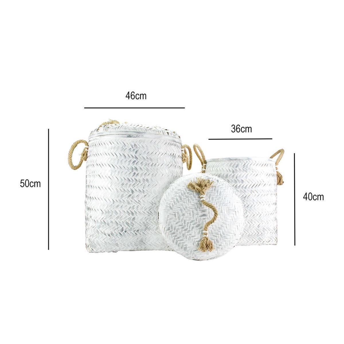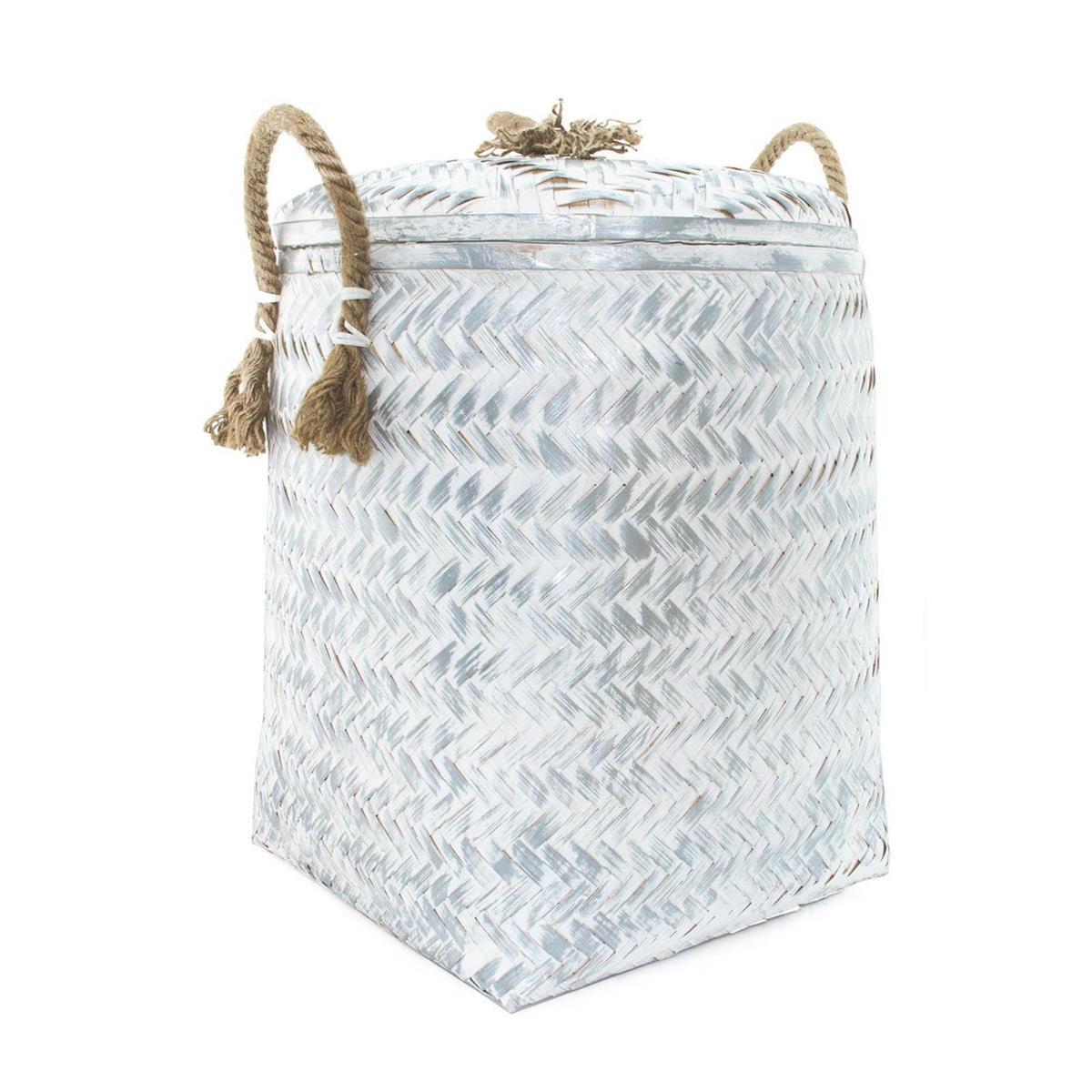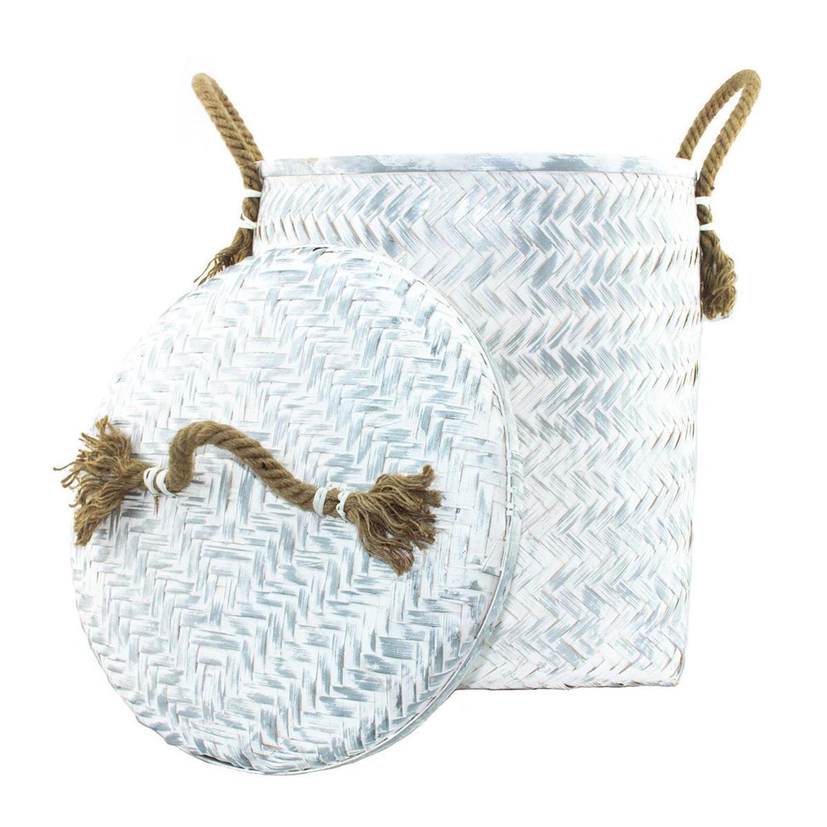 Durchmesser: 46 cm / Höhe: ca. 50 cm / Farbe: weiß-grau / Material: Bambus / Details: Deckel mit Griff und Henkel am Korb