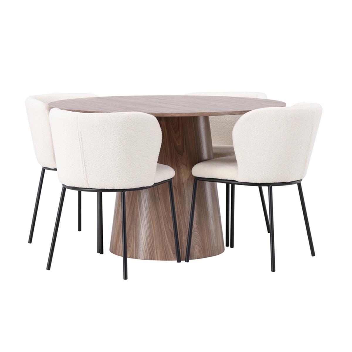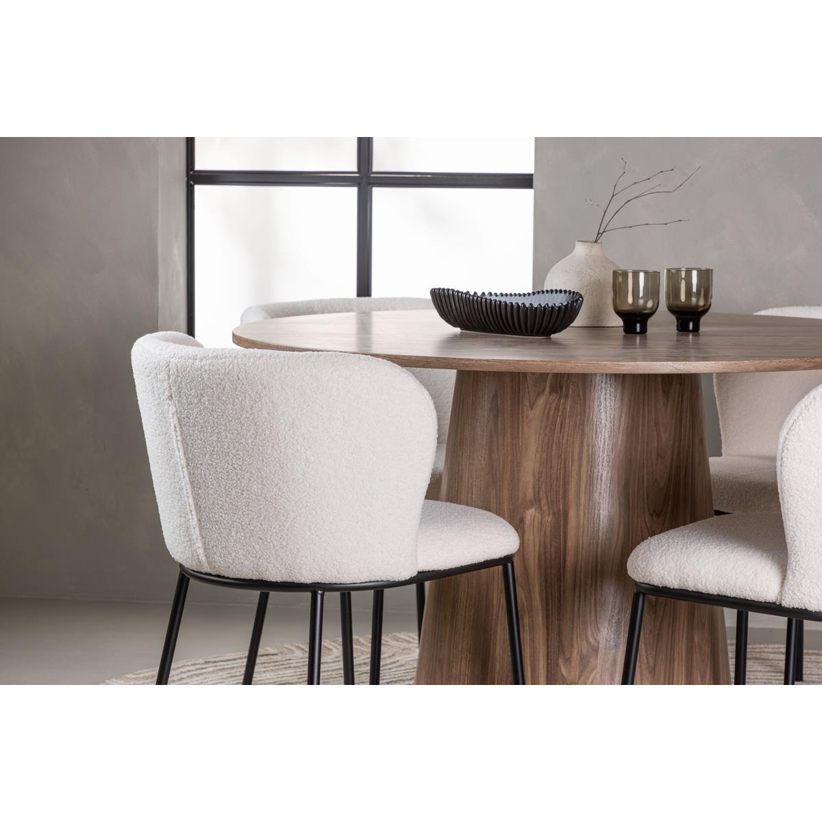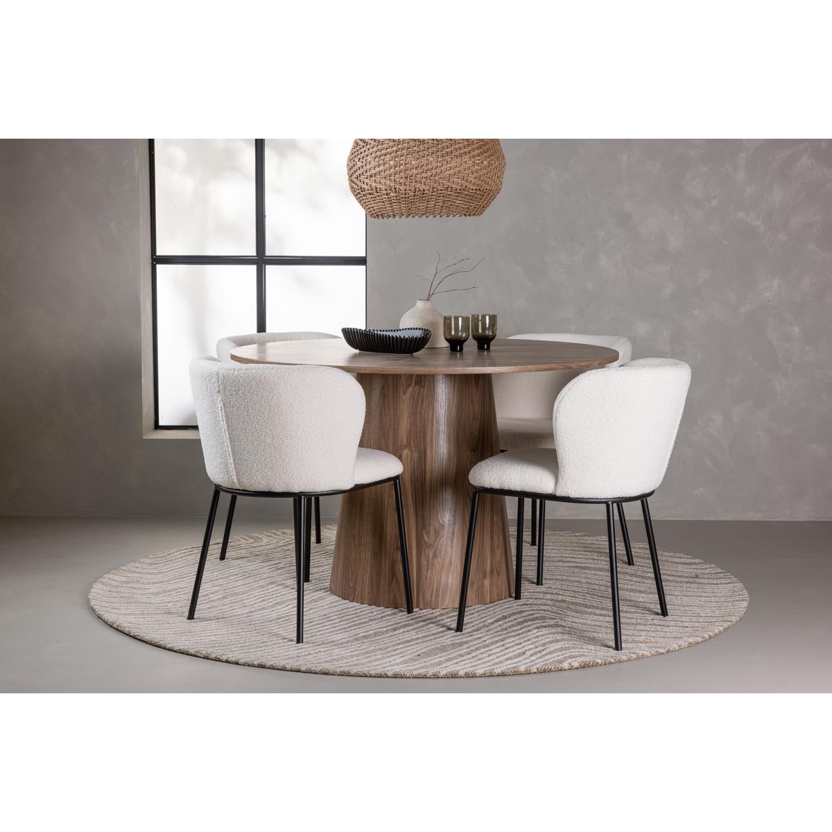 Mit der Essgruppe EDINA holen Sie sich skandinavisches Design und gemütlichen Komfort nach Hause. Das Set besteht aus einem runden Esstisch in eleganter Holzoptik und vier bequemen Esszimmerstühlen in weichem Bouclé-Stoff.