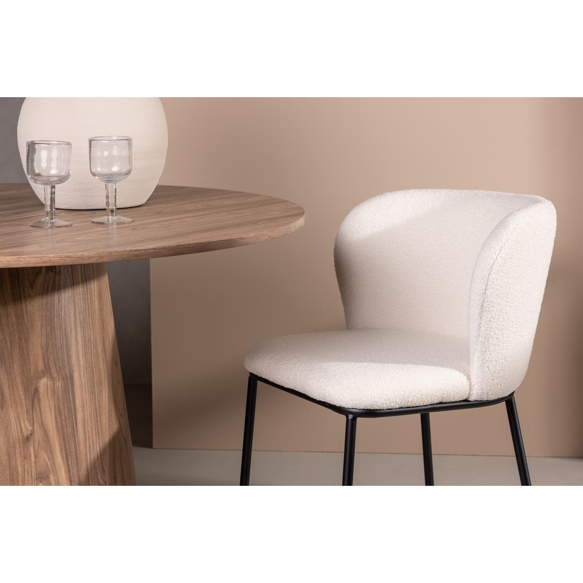 Die vier Stühle verbinden Komfort mit zeitloser Eleganz. Der gepolsterte Sitz aus weißem Bouclé-Stoff bietet hohen Sitzkomfort, während die schwarz lackierten Metallbeine für eine moderne Leichtigkeit sorgen.