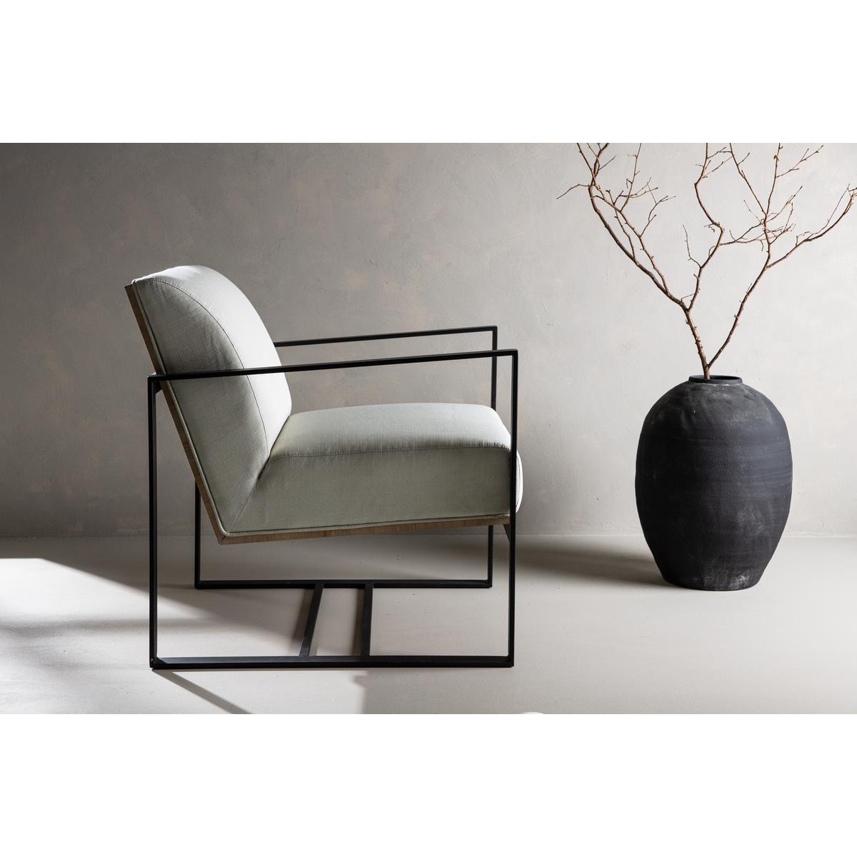 Der Sitz ist in Offwhite gehalten und bietet eine bequeme Sitztiefe sowie eine weiche Polsterung, die dem Möbelstück einen einladenden Eindruck verleiht. Der Korpus ist minimalistisch, in geraden nordischen Formen, gefertigt aus schwarzem Metall.