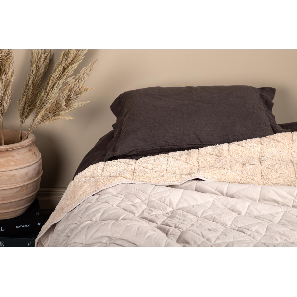Die Tagesdecke NINA bringt Gemütlichkeit und Abwechslung ins Schlafzimmer und verleiht jedem Raum das gewisse Etwas. Durch ihre zwei unterschiedlichen Seiten passt sie sich perfekt Ihren Bedürfnissen an: eine glatte, gesteppte Seite sorgt für einen ruhigen, ordentlichen Look, während die andere aus weichem Sherpa für Wärme und ein kuscheliges Gefühl sorgt.