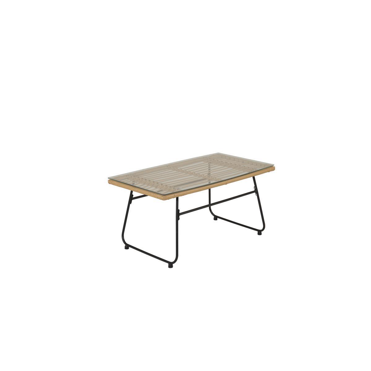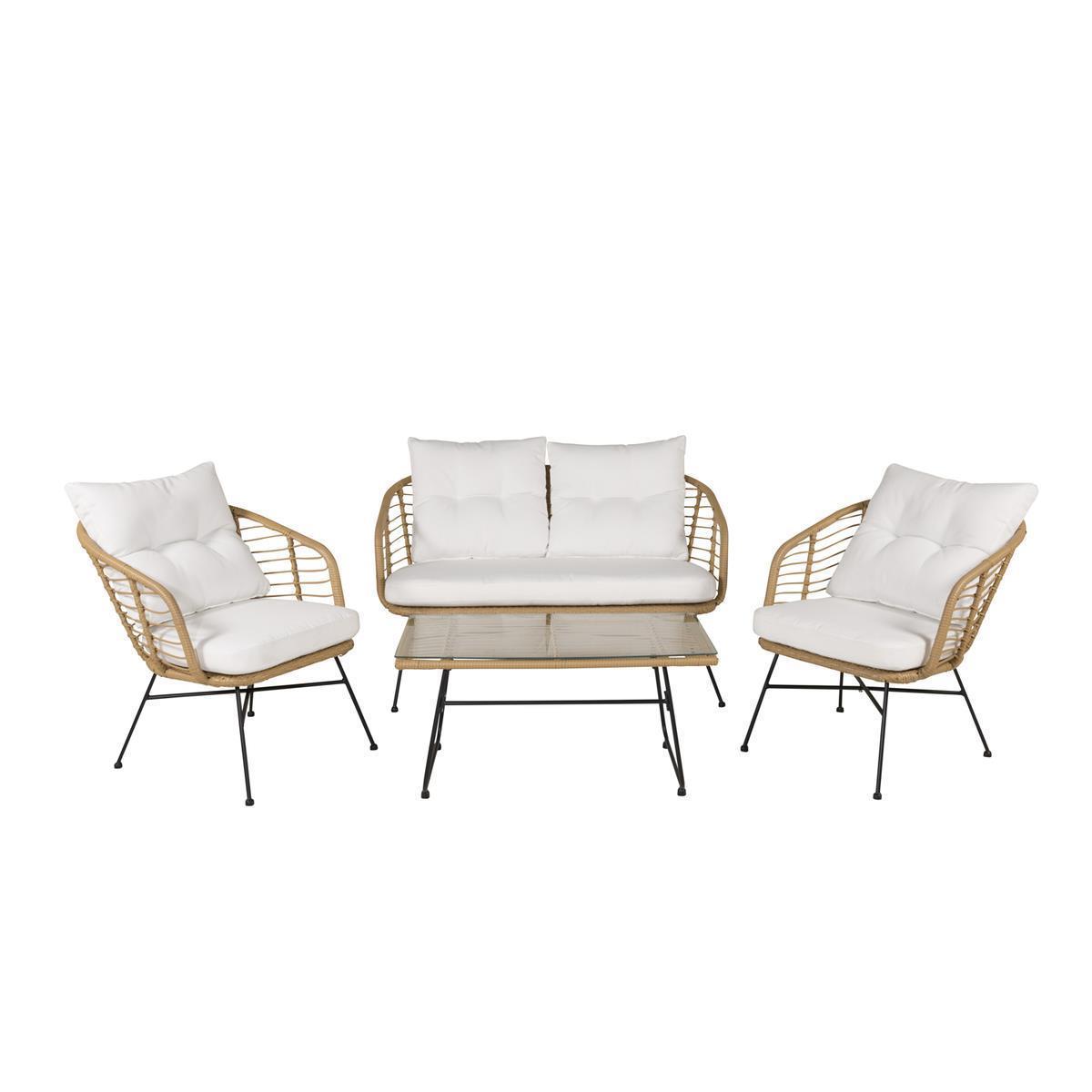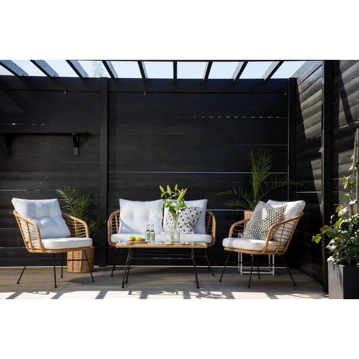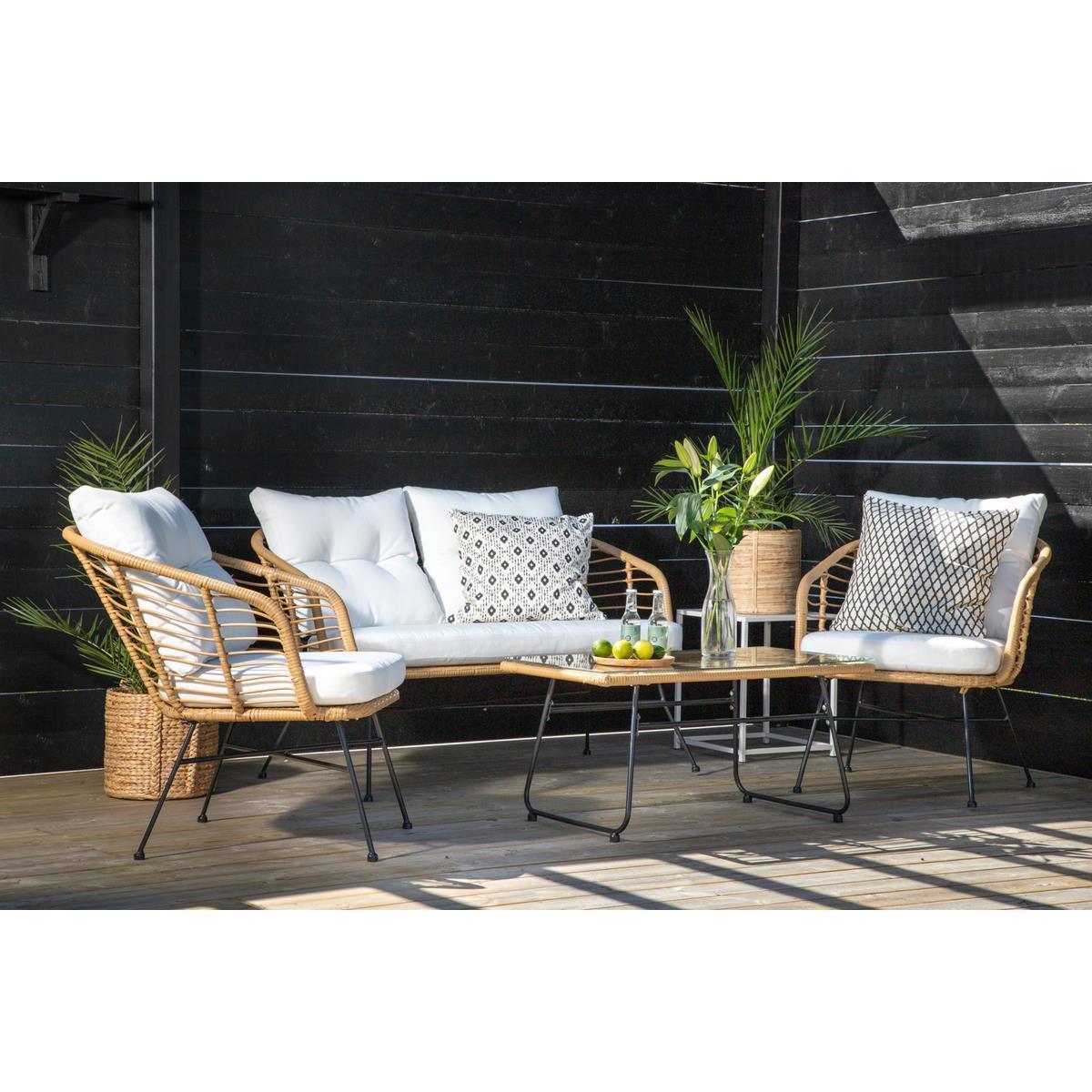 Inklusive weißen Kissen und einem Couchtisch mit Details aus Korbgeflecht und einer Tischplatte aus Glas. Dekorieren Sie die Terrasse mit einer Loungegruppe, die die Spätsommerabende mit Ihren Lieben garantiert verlängert!